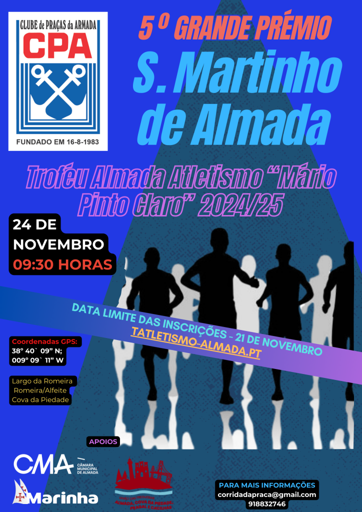 A 24 Novembro 2024 vai realizar-se o 5º Grande Prémio São Martinho de Almada, prova inserida no Troféu de Almada Atletismo ‘Mário Pinto Claro’ 2024/2025.