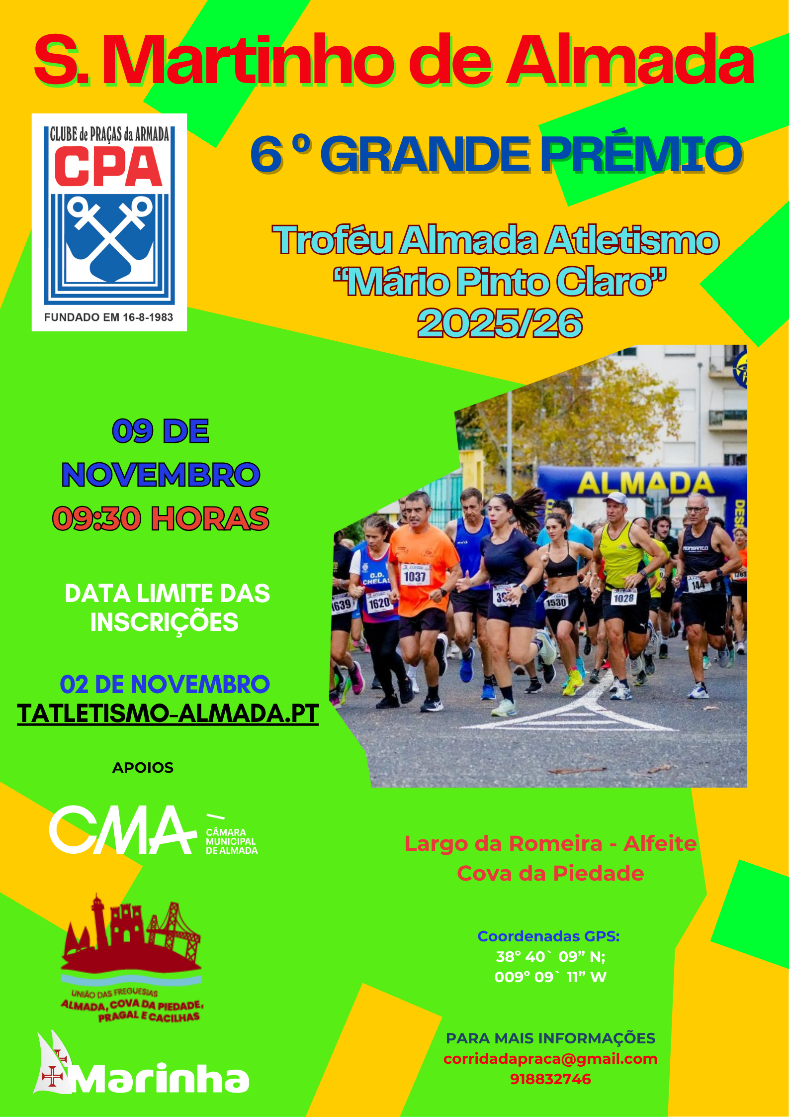 A 09 Novembro 2025 vai realizar-se o 6º Grande Prémio São Martinho de Almada, prova inserida no Troféu de Almada Atletismo ‘Mário Pinto Claro’ 2025/2026.