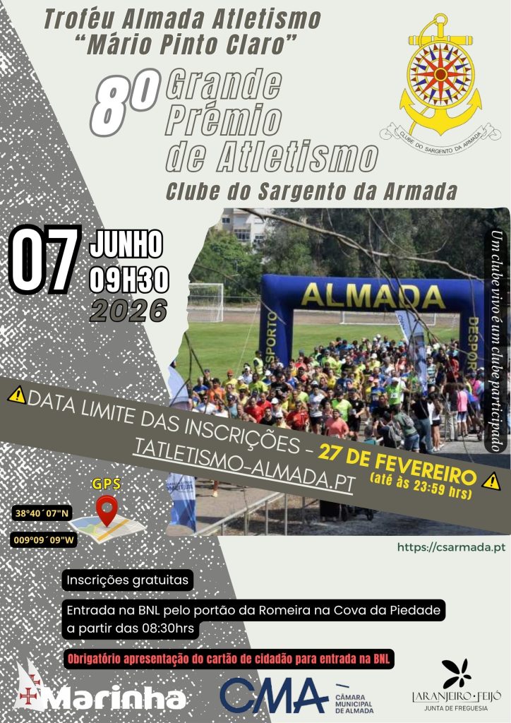 A 07 Junho 2026 vai realizar-se o 8º Grande Prémio do Clube do Sargento da Armada, prova inserida no Troféu de Almada Atletismo ‘Mário Pinto Claro’ 2025/2026.